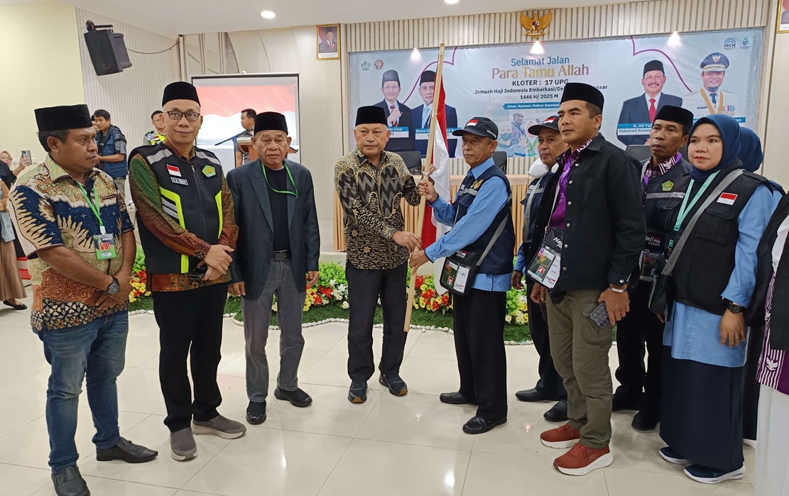 Pelepasan JCH Kloter 17 asal Maluku Utara embarkasi Makassar ditandai dengan penyerahan bendera dari Wakil Gubernur H. Sarbin Sehe kepada ketua Kloter 17 Safri Kamaria.